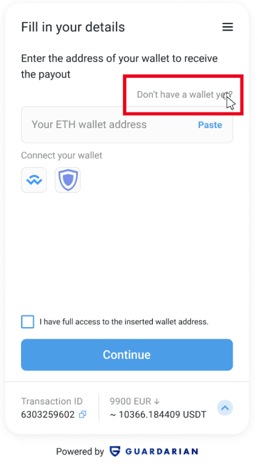 If you’re making a transaction through Guardarian, don’t worry about having a wallet already. Simply click the “Don’t Have Wallet Yet” button during your purchase, sale, or swap, and in seconds you’ll have your first wallet—even if you’ve never created one before.