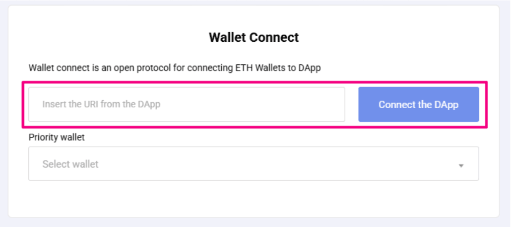 In the WalletConnect section, paste the copied connection link (URI). Then select the ETH wallet you want to use for the transaction from the dropdown list. Click Connect DApp.